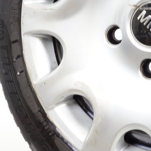 Steel set of Original Mini Cooper F55 F56 steel rims 15 inch with Michelin Alpin A4 winter tires. These rims are original rims of the Mini brand and suitable for the F55 F56. The wheel set is a steel set. The caps show paint damage.