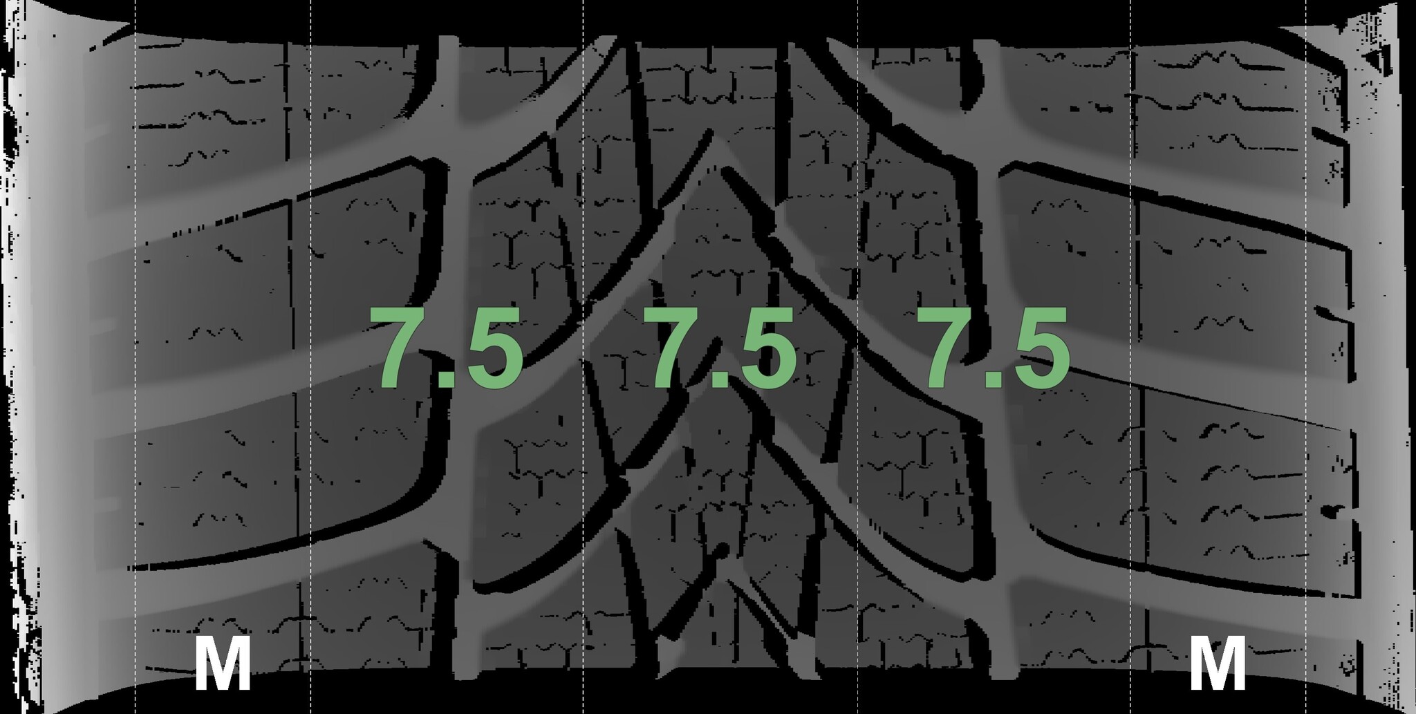 Condition | Profile depth | DOT | Front Left | Demo studs still visible | 7.5 mm | 2123 |