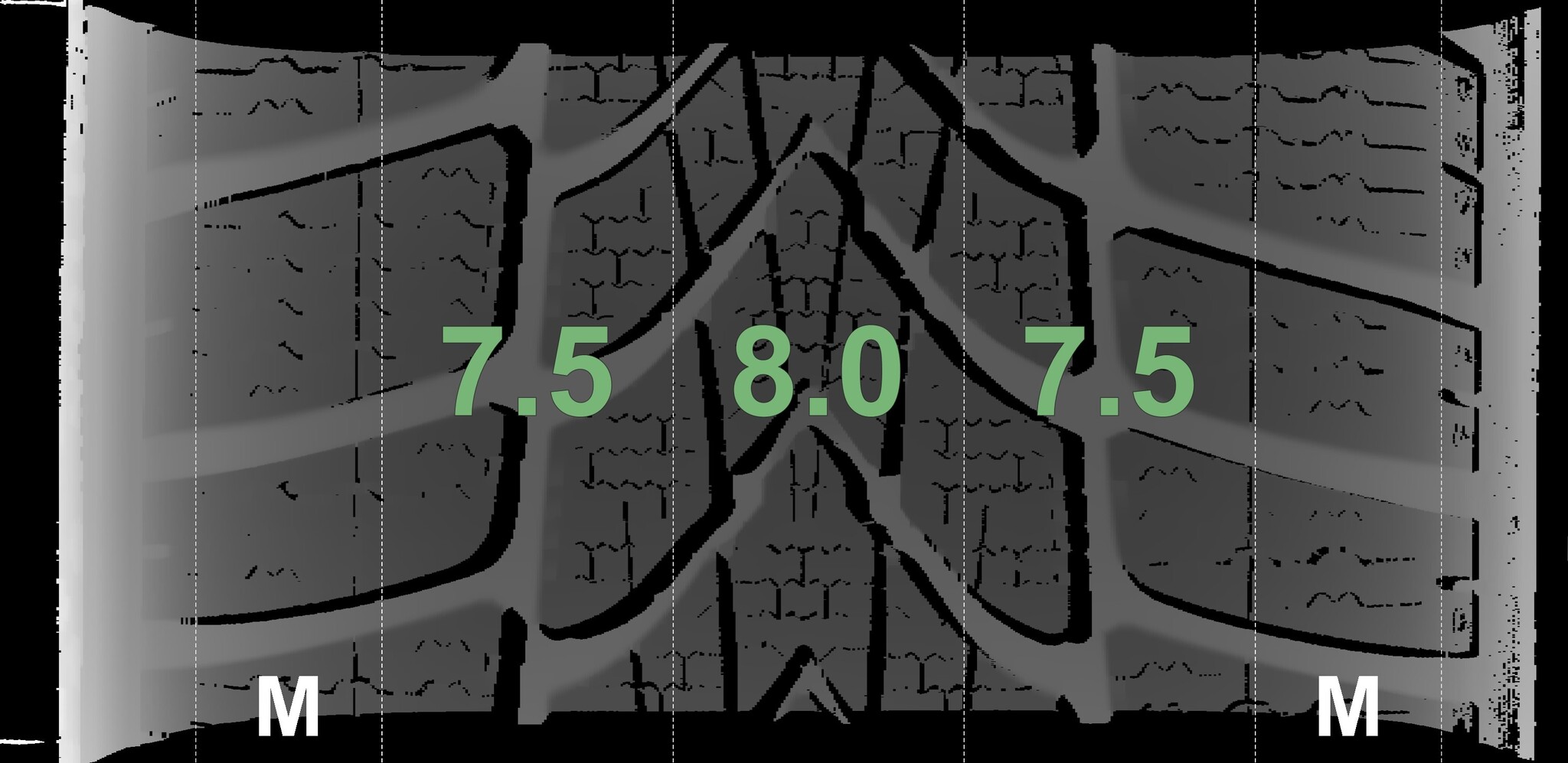 | Condition | Profile depth | DOT | Front Right | Demo studs still visible | 7.7 mm | 2123 |