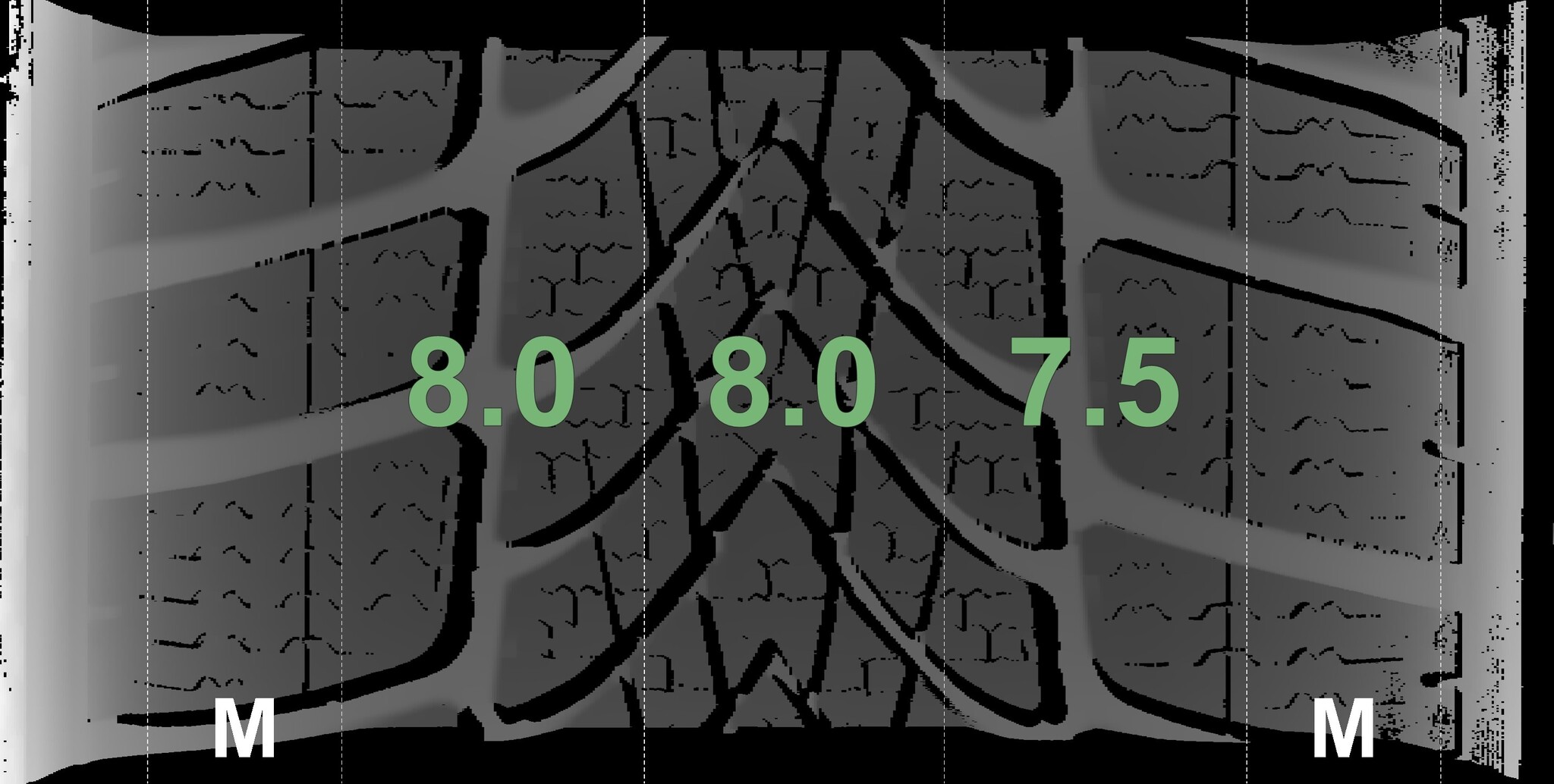 | Condition | Profile depth | DOT | Front Left | Demo studs still visible | 7.7 mm | 2123 |