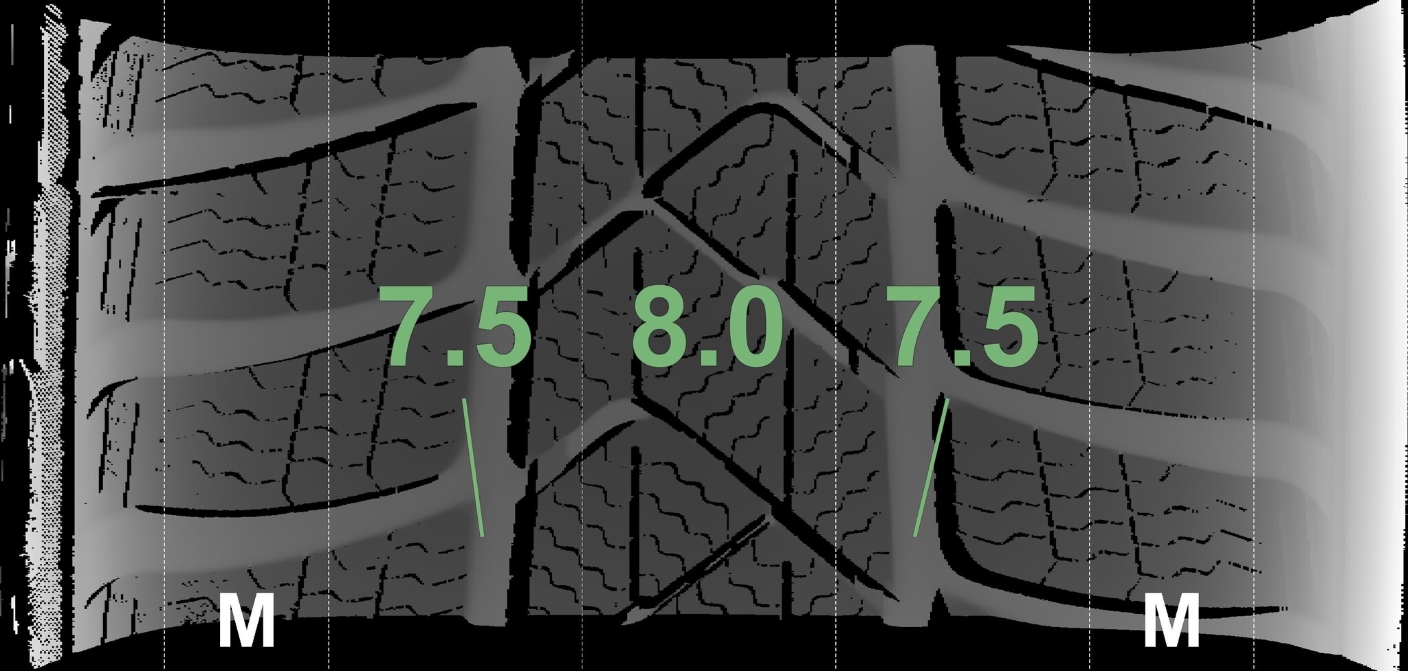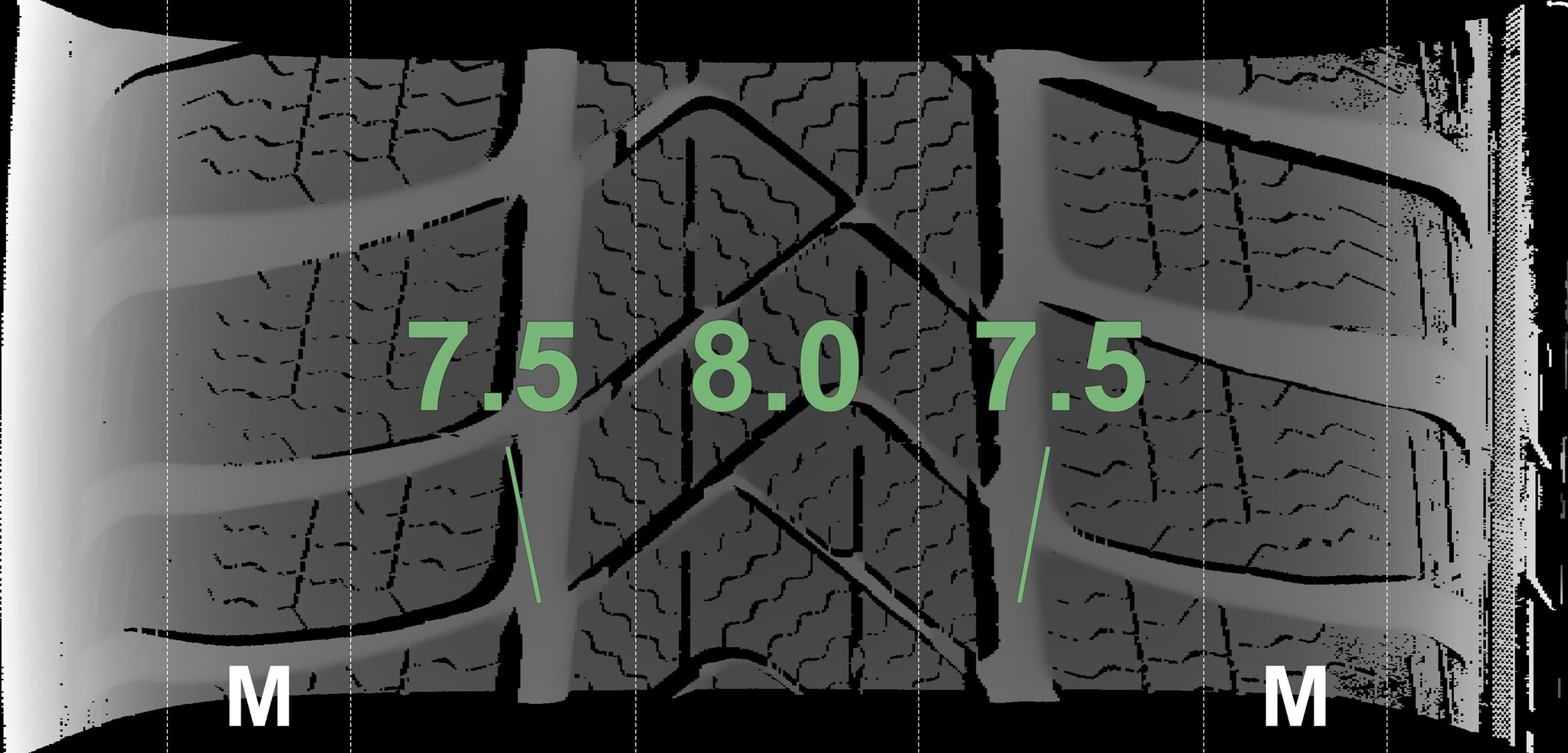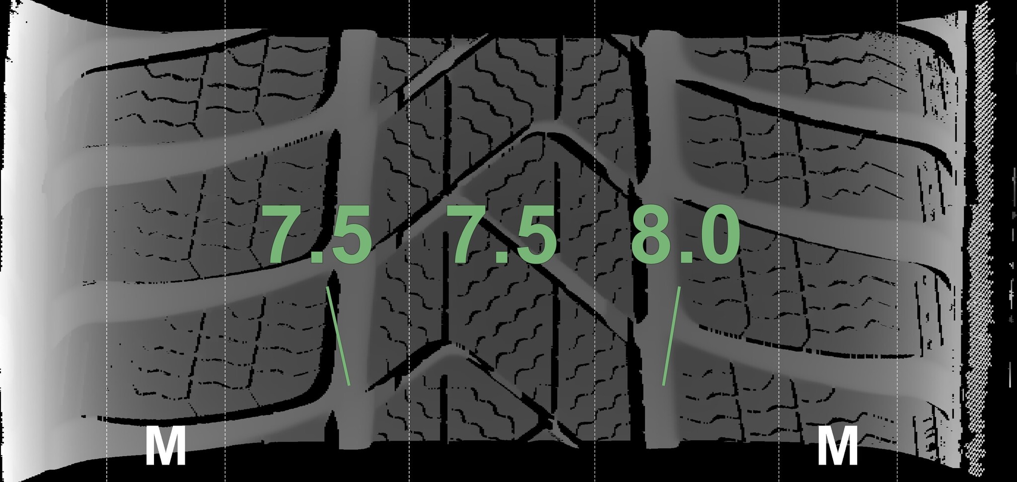 Condition | Profile depth | DOT | Front Left | Demo studs still visible | 7.5 mm | 3622 |