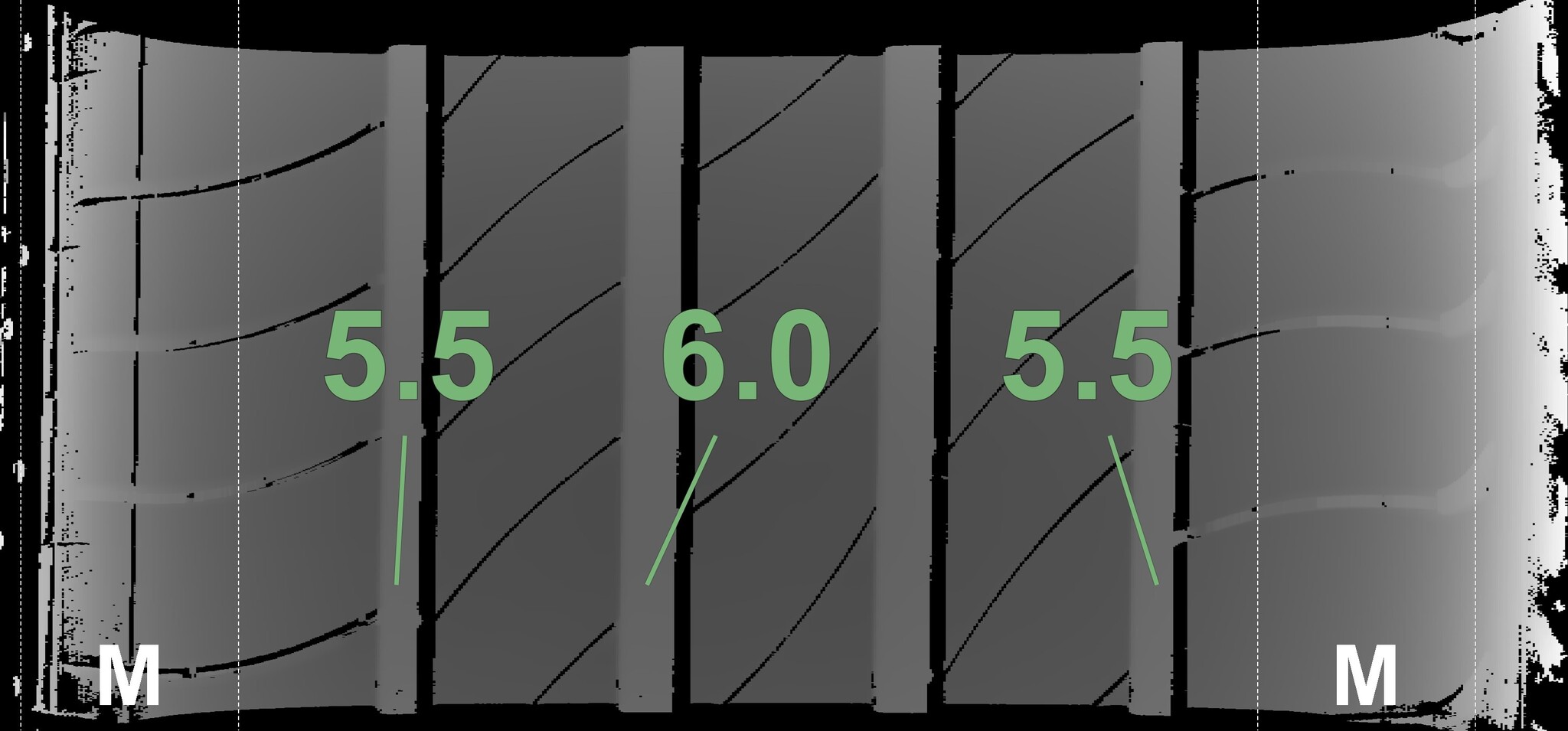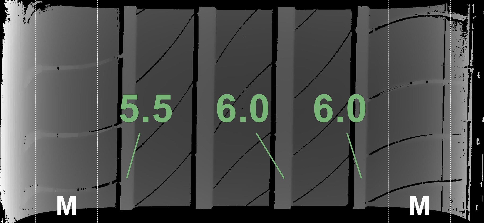 | Condition | Profile depth | DOT | Front Left | Demo nubs still visible | 5.8 mm | 3824 |