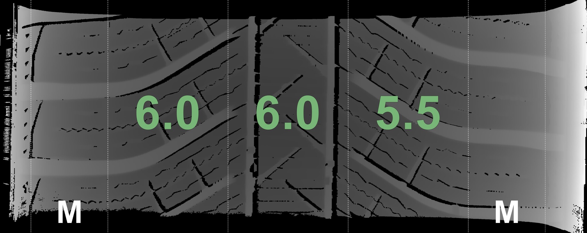 | Condition | Profile depth | DOT | Front Left | Used | 6.0 mm | 4819 |